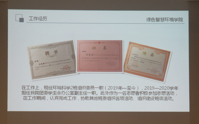 他们的陈述或慷慨激昂、或娓娓道来,竞选者们的个人展示配合具有个人特色的PPT,使得整个答辩别具一格,展现了他们在学习和工作方面的能力。竞选者们在答辩结束后,评委老师对他们进行了点评,指出了他们在答辩过程中的不足和申报资料上的问题。
