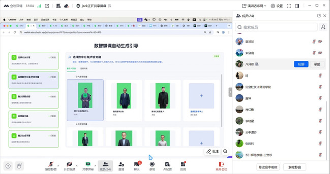 在人工智能技术飞速发展的当下,教育领域正经历着深刻的数字化变革,人工智能技术的应用已从工具层面上升至教育理念与课堂生态的重构。为积极响应国家教育现代化战略,落实“AI + 教育”创新行动计划,着力提升教师数字素养与智慧课程建设能力。11月29日,长江师范学院绿色智慧环境学院组织全院教师参与《零基础速成:AI 赋能下的数智人微课实操》线上专题工作坊。
